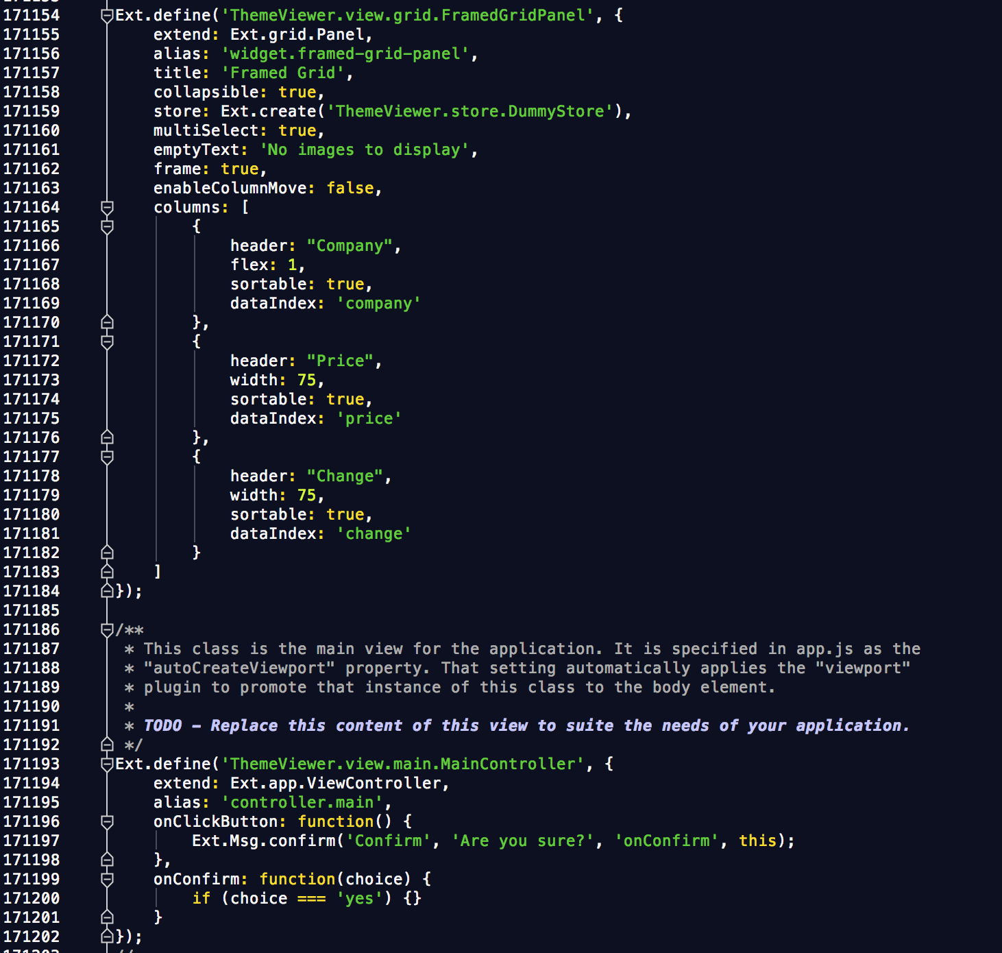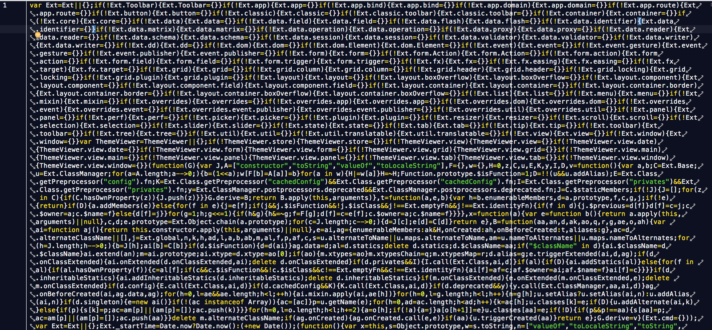 실제로 build production과 똑같이 파일이 만들어졌습니다. 하지만 파일을 살펴보시면 여러개의 ExtJS Class로 쪼개진것들이 하나의 파일로 복사 붙여넣기 되어있는 형식으로 된걸 확인할수 있습니다.